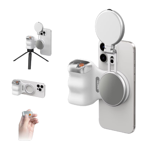 اضاءة تصوير للجوال صغيرة تجمع بين قبضة مغناطيسية وكشاف سيلفي مضغوط لتصوير احترافي في أي مكان، مع سهولة تثبيت وتعديل الإضاءة.